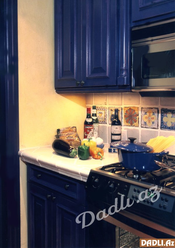 Əminik ki, bir çox oxucumuz mavi kölgə bənzəyir. mətbəx üçün dərin ton və rəngarəng mebel ən yaxşı seçim ola bilər, bu halda ona və qara texnikası diqqəti yayındırmaq istəmirəm ki, fəaliyyət göstərir. Rəngarəng kafel mətbəx apron bütün rəngləri harmonik birliyə bağlaya bilər.