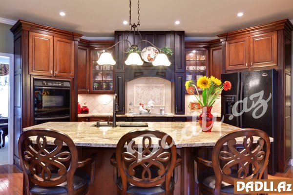 Qaranlıq ağac və qara texnikadan hazırlanmış mətbəx şkafları bir zaman sınaqdan keçirilmiş ittifaqdır, lakin yeni bir şəkildə təqdim olunur. Alətlərin simmetrik təşkili sayəsində, bütün kompozisiya inanılmaz harmonik və dəbdəbəli görünür.