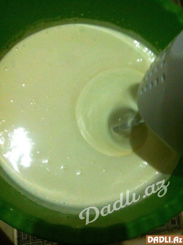 Yumurtayla pesoku mikserlə agarıncayadək çalıb,unu töküb yavaş yavaş qarışdırmaq.