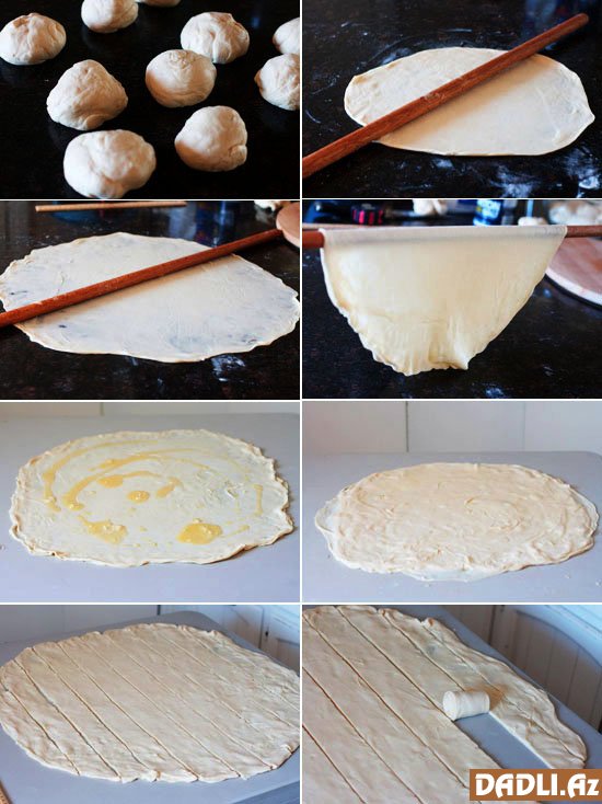 Xəmiri kündələyib 9 bərabər hissəyə ayırın. Hər hissəni kündələyin.