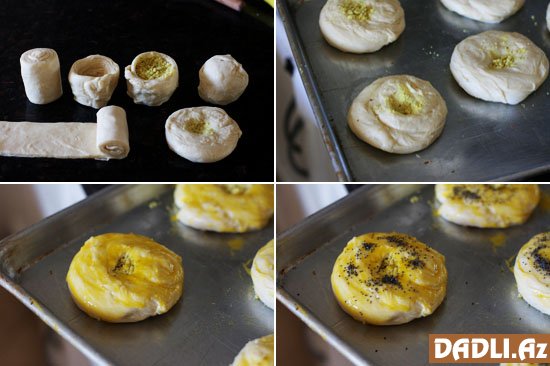Əvvəlcə xəmir hazırlanır. Balaca bir kasada mayanı ilıq suda həll edib təxminən 10 dəqiqə köpüklənməsi üçün gözləyin.Unu iri qaba ələyin, üzərinə duz əlavə edib qarışdırın. Ortasında bir çökək açıb maya qarışığı, süd, yumurta və yağı əlavə edin. Əlinizlə bunları qarışdırın. Xəmiri unlanmış taxta (və ya masada) yumşaq və elastik olana kimi, 10 dəqiqə yoğurun. Xəmir çox bərk olmamalıdır. Əgər xəmir hələ də əlinizə yapışırsa, onda bir az da un əlavə edib yoğurun. Xəmiri iri qaba qoyub üzərini dəsmal ilə örtüb gəlməsi üçün isti yerə qoyun, təxminən bir saat yarımlıq.