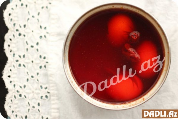 Yumurtaları corablardan çıxardın, ehtiyyatla göyərti yarpaqlarını götürün və quru bezin üzərində 1 saat qurumağa qoyun. Quruduqdan sonra yumurtaları xonçaya qoyarkən onların daha parlaq və tünd rəngli olması üçün üstlərinə nazik qat salfetlə bitki yağı çəkin.