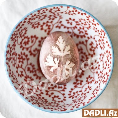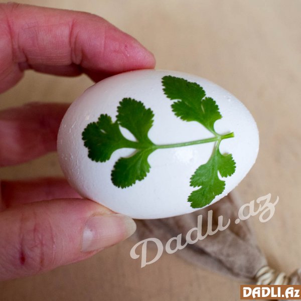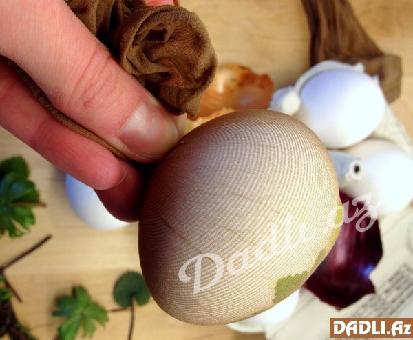 Sonra bir parça dəsmal və salfetlə yumurtaların hamsının qabıqlarına sirkə çəkin. Yumurtaların üzərində bəzəkli formalar olsun deyə keşniş, nanə yarpaqlarından hansını istəsəniz yumurtanın üzərinə qoyun, sonra bitki yağından həmin qoyduğunuz yarpaqların üzərinə çəkin. Hazır yumurtaları əvvəlcədən kəsilmiş corab hissəsələrinin içərisinə yerləşdirin. Əlinizlə bitki əzilərsə düzəldin. Sonra corabların baş hissələrini bağlayın ki, yumurta içindən çıxmasın. Bu prosesi bütün yumurtalarda təkrar edin.