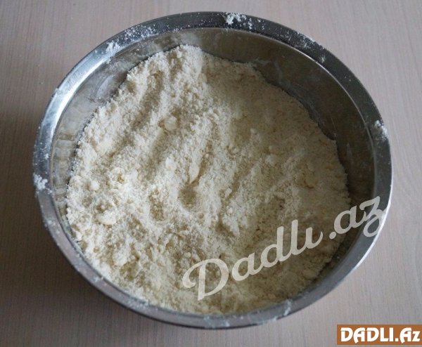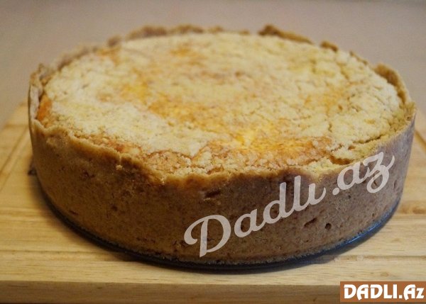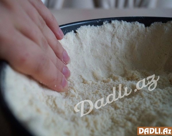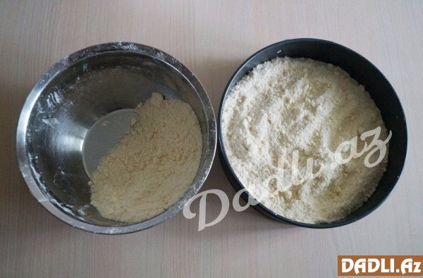 Bir qabda un, 1 stəkan şəkər tozu, soda və kərə yağını əlinizlə ovuşdurun. Unlu ovuntunun 1/3 hissəsini diametri 20-22 sm olan formaya (kənarları açılan) əlinizlə basaraq formanın ortasına və kənarlarına yayın.