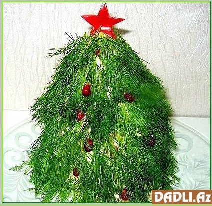 Sonra təpələmə boşqaba yığın. Göy soğan və ya kərəviz, yerkökü və ağ turpdan istifadə edərək onu, şəkildə gördüyünüz kimi, şam ağacı formasına salın. Əgər soğanın dadı xoşunuza gəlmirsə, bəzək üçün şüyüddən də istifadə edə bilərsiniz.