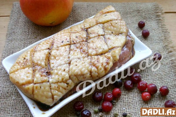 Boşqaba dilimlənmiş ördək filesini, alma dilimləri və mərcanını düzün. Zövqə görə üzərinə balzamik sousu töküb göyərtiylə bəzəyin . Dadlı yeməyinizi süfrəyə verə bilərsiniz.