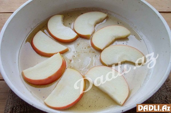 Sobadan çıxartdığınız isti tavaya alma dilimlərini düzüb 1 dəqiqə saxlayın.