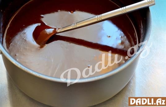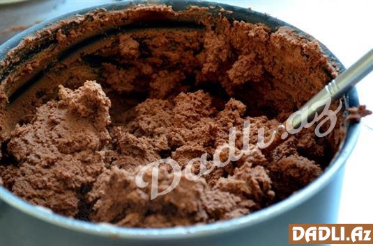 Daha sonra şokoladı krem qarışımının üzərinə bir hissə yağ əlavə edirik. Qarışıdırıb, şəkildə formaya gətiririk.