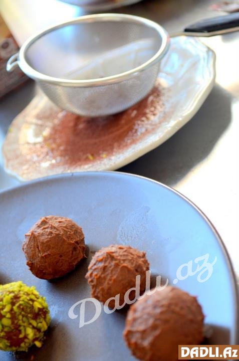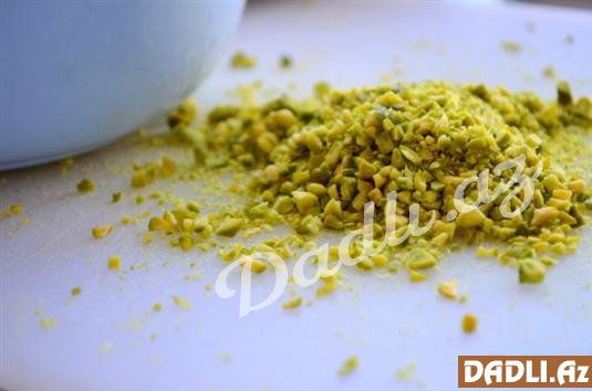 Daha sonra fıstıqları xırda şəkildə doğrayırıq. Sonra şokoladlı qarışı istədiyimiz formaya salıb, soyuducuya qoyu və üzərini fıstıqla bəzəyirik.