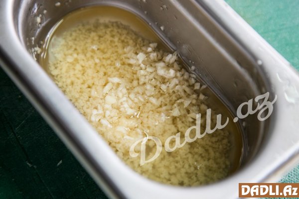 Ayrı qabda zeytun yağında xırda şəkildə doğranılmış sarımsaqları qızardırıq. Daha sonra onu qarğıdalının üzərinə çəkirik.