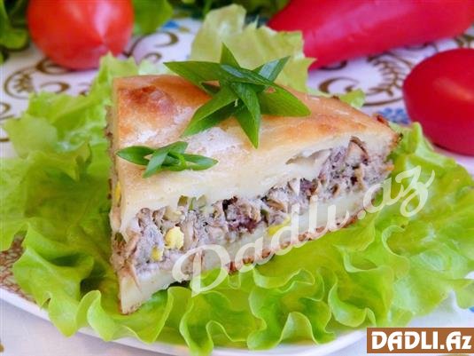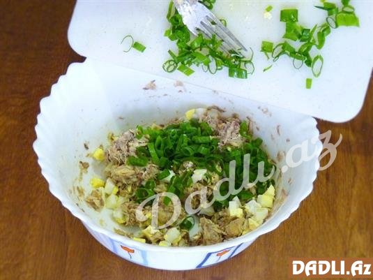 İçliyi üçün. Qaynadılmış və xırda doğranılmış bir ədəd yumurtanın üzərinə konservləşdirilmiş balıq və göy soğan əlavə edirik.