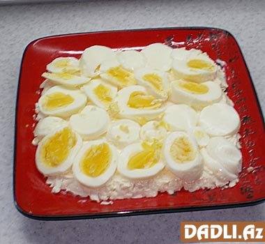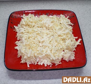 Ərinmiş pendiri birbaşa salat boşqabının üstündə sürtgəcin iri gözündən keçirin. Üstünə bolluca mayonez çəkin.