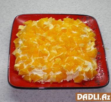 Portağalı təmizləyib kubik doğrayın. Salatın üstünə düzün. Vəssalam. Orijinal dadlı salat hazırdır. Zövqünüzə görə bəzəyə bilərsiniz.