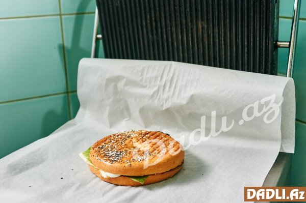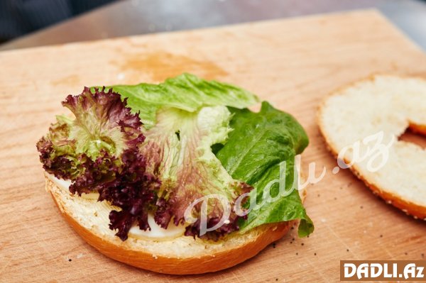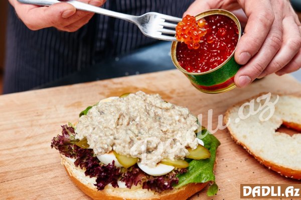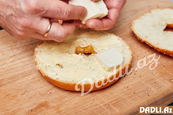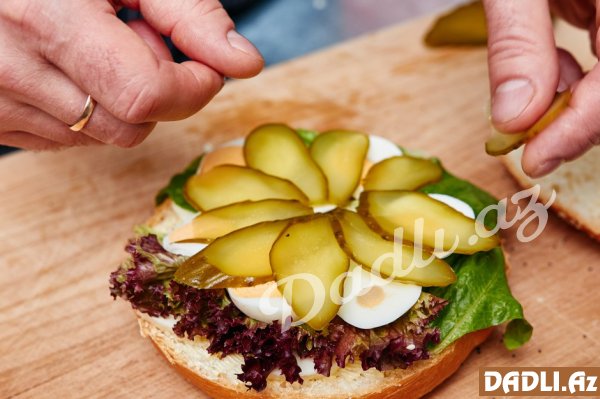 Ərzaqları hazırlayırıq, ilk olaraq çörəyin üzərinə pendir, daha sonra kahı əlavə edirik.