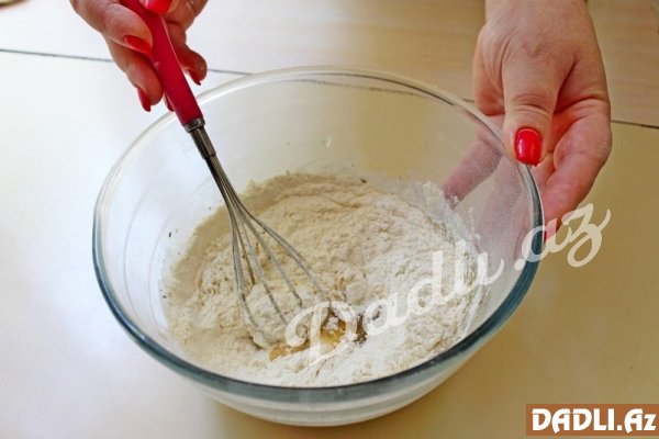 Yumurtanın üzərinə bitki yağı və origano əlavə edib, qarışdırırıq. Daha sonra un töküb qarışdırmaqda davam edirik.