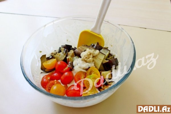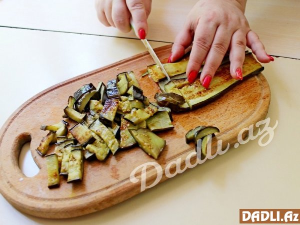 Yarı bişmiş badımcanları xırda şəkildə doğrayır, üzərinə kvadrat formasında doğradığımız pomidorları əlavə edirik.