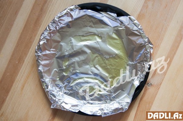 Ərzaqları hazırlayırıq, daha sonra falqa kağızını zeytun yağı ilə yağlayırıq.