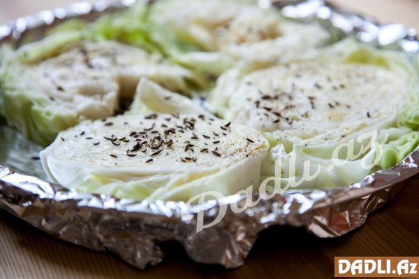 Daha sonra kələmin üzərinə cirə, duz, istiot və zeytun yağı əlavə edib, 200 dərəcəli sobada 40-45 dəqiqə bişiririk.