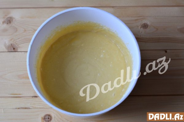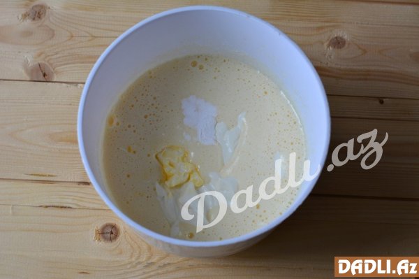 Yumurtanı çalırıq. Daha sonra üzərinə yumuşaldılmış kərə yağı və vanil əlavə edərək çalmağa davam edirik. Un da tökdükdən sonra məhlul halına gələnədək qarışdırırıq.