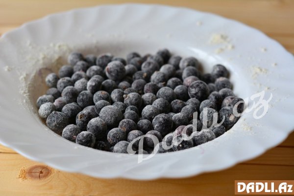 Qarağatın üzərinə biraz un səpirik. Daha sonra az əvvəl hazırladığımız məhlulu keks qabına yerləşdirir qarağatları da tökməyi unutmuruq. Sobanı yaxşı isidirik, 180 dərəcədə 60 dərəcə bişməyə qoyuruq.
