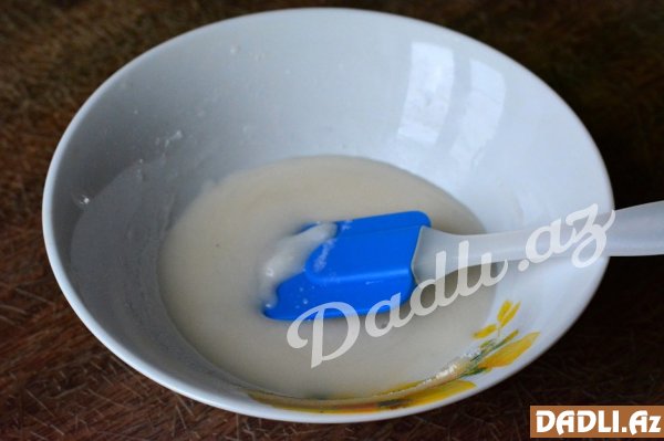 Keksin üzəri üçün şəkər pudrasını su ilə qarışdırırıq, çalışmaq laızmdır ki, suyu çay qaşığı ilə əlavə edilsin.