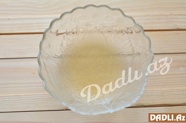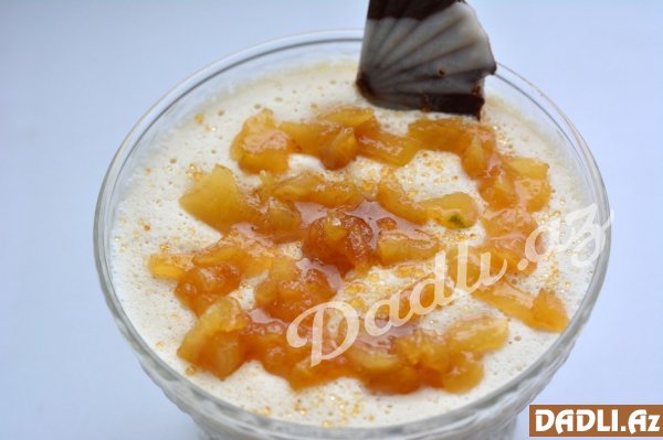 Südün üzərinə şəkər tozu, vanil və xama əlavə edirik. Otaq temperaturunda isə jelatini götürürük.