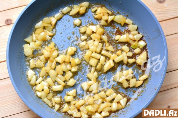 Armudları yuyur, təmizləyir, xırda şəkildə doğrayır və tavada az yağda bişiririk. Hazır olan armudları ilk addımda etdiyimiz məhulla qarışdırırıq. Üzərinə şkolad əlavə etməyi unutmayın!