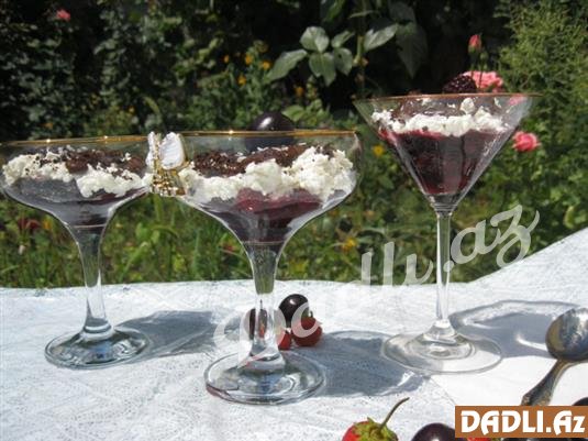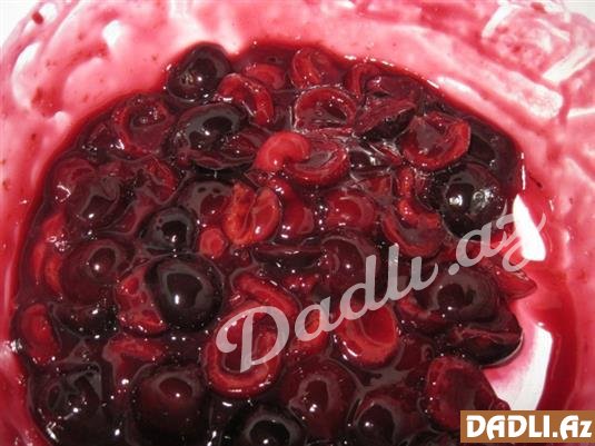Kəsmiyi şəkər pudrası ilə qarışdırıb, üzərinə krem əlavə edirik. Daha sonra biraz kokos töküb qarışdırır, məhlul halına gətiririk. Hazır olduqdan sonra bakala əlavə edib, üzərinə bəəzk üçün bir neçə albalı qoyuruq.