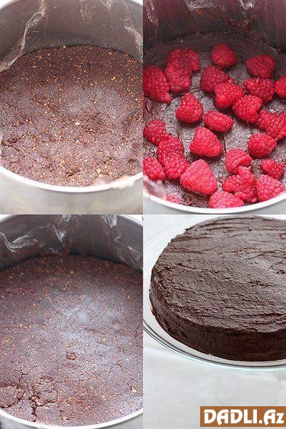 Kənarı açılan formaya xəmirin birinci qatını qoyub, yaxşıca döşəyin. Şokoladlı qlazurdan bir neçə qaşıq üzərinə yayın. Giləmeyvələri əzib qarışdırın, üzərinə çəkin. Xəmirin ikinci qatını əlinizlə hamarlayıb giləmeyvənin üzərinə yerləşdirin.