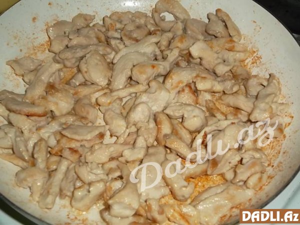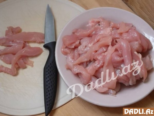 Bibərləri təmizləyir və bölürük. Daha sonra toyuğun döş ətini uzunsov formada doğrayırıq.