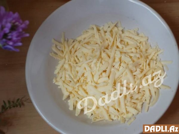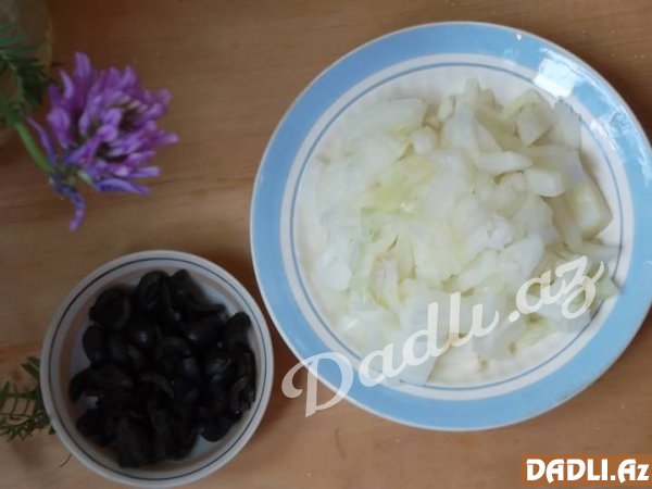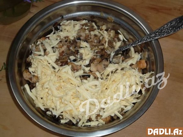 Göbələk, soğan və zeytunu xırda şəkildə doğrayırıq. Daha sonra üçünü birlikdə bişiririk. Bişdikdən sonra üzərinə sürtkəcdən keçirdiyimiz pendiri də əlavə etməyi unutmuruq.