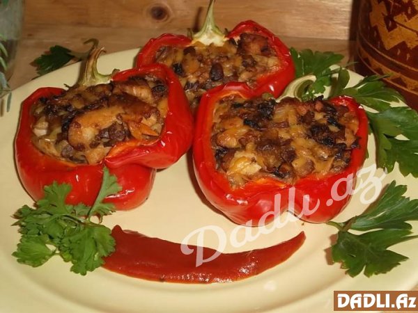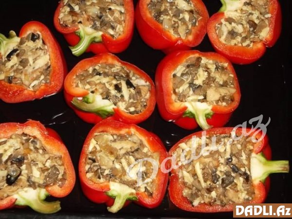 Hazırladığımız qarışımı bibərin içərisinə doldurub, 200 dərəcəli sobada bişməyə qoyuruq. Bəzək üçün yanına zövqünüzə görə göyərti də əlavə edə bilərsiniz.