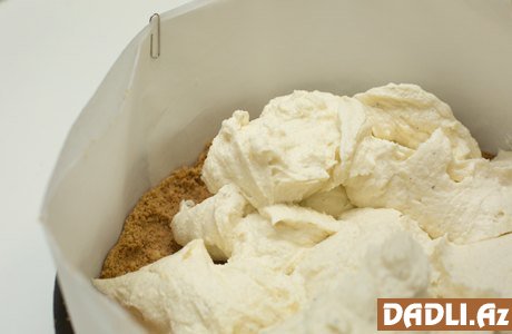 3. Alınan un kimi peçenyalara bir qədər əridilmiş yağ vurularaq, formanın dibinə yerləşdirilir. Sonra digər boşqabda kəsmiyə yağlı qaymaq qatılır, onların üzərinə blenderdə çalınmış yumurta, şəkər tozu və şəkərli vanil əlavə edilib qarışdırılır.