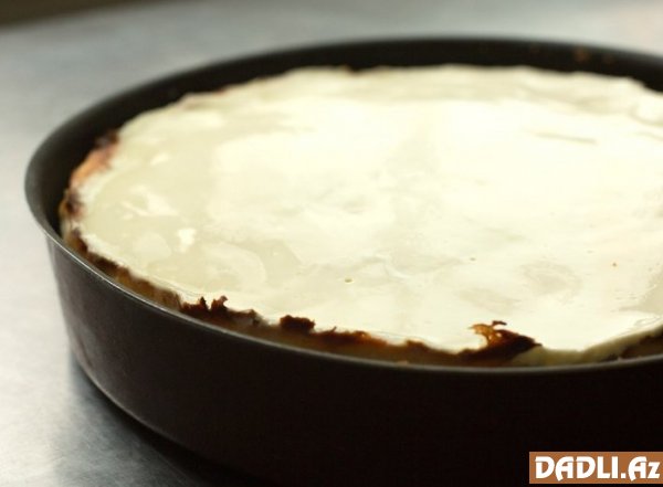 4. Nəhayət, 50 dəqiqədən sonra çizkeyk sobadan çıxarılır, üzərinə birdaha kəsmikli məhlul əlavə edilir, 2 xörək qaşığı şəkər tozu səpilir və bir çimdik vanil əlavə edilərək yenidən 7 dəqiqəlik sobaya yerləşdirilir və sobanın temperaturu 200 dərəcəyədək artırılır.
