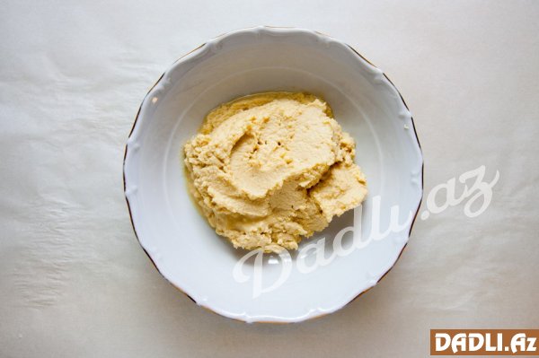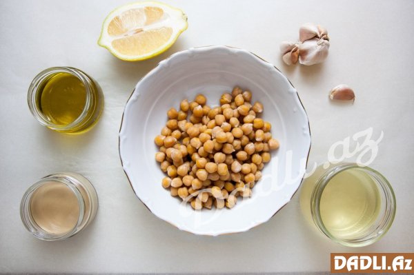Noxudun üzərinə limon şirəsi, sarımsaq, duz, küncüt, zeytun yağı və bulyon (100-120 qr) əlavə edib blenderdən keçiririk.