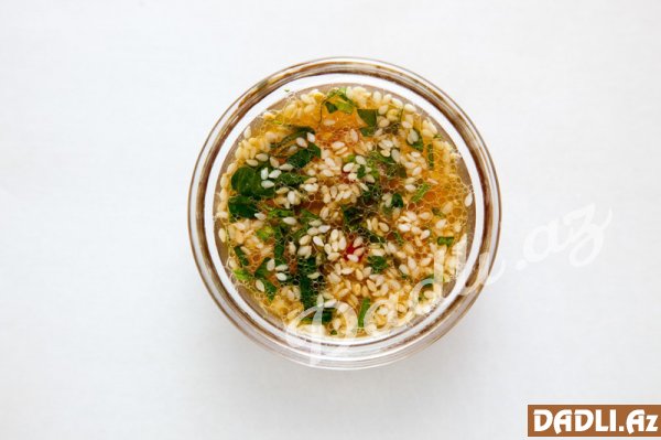Daha sonra salatı servis edəcəyiniz qaba ya da ki, maraqlı təqdimat olsun deyə, kiçik bankalarla yığın, küncüt və keşniş yarpağı ilə dekor edib süfrəyə servis edin.