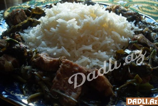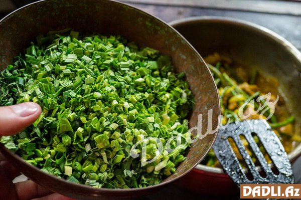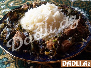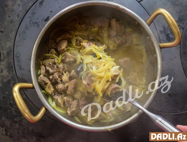 Daha sonra zəfəran əlavə edinki xüsusi dad versin. Doğranmış göyərtini ətə əlavə edib, duz, istiot vurub rəngi dəyişənədək bişirin.
