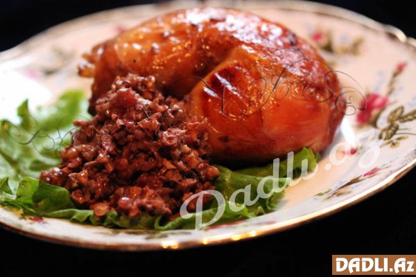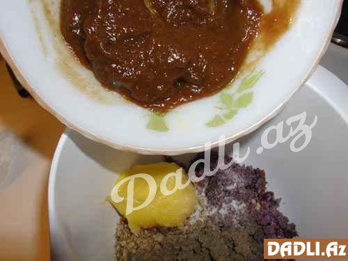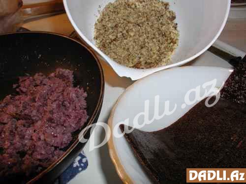 Əvvəlcə qozu ət maşınından keçirin. Daha sonra soğanı təmizləyib onu da eyni qayda ilə ət maşınından keçirin. Soğanı cunanın arasına qoyub suyunu sıxın. Suyu sıxılmış soğanı kərə yağında qovurun.