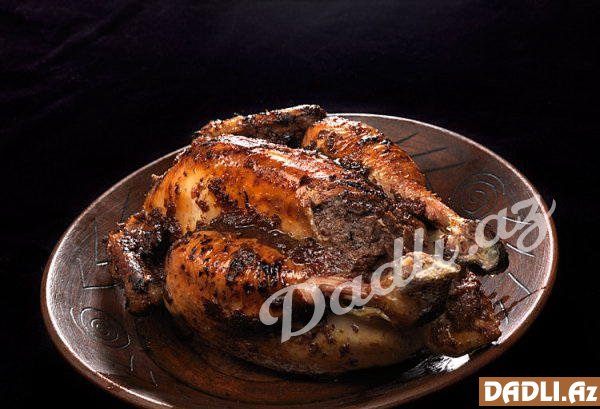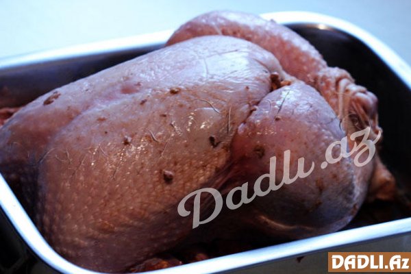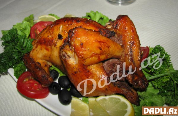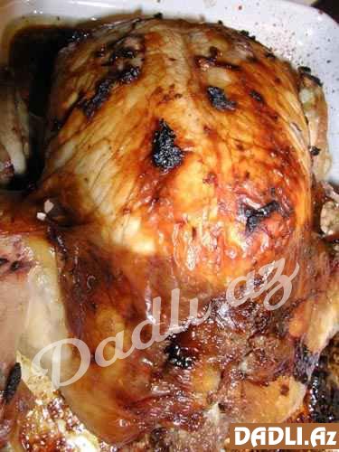 İçi doldurulmuş toyuğun qarnını sapla tikin. Qanadının altını, budlarını bıçaqla çərtin. Qızdırılmış sobada yarım saat bişirin. Hər iki üzü qızaranda , sobadan çıxarıb servis edə bilərsiniz.