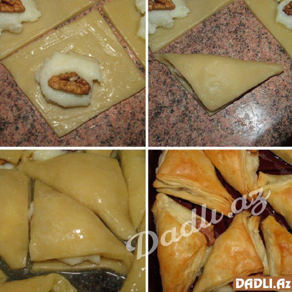 Kərə yağını əridib qalan bitki yağı ilə qarışdırın. Hər kvadratın üzərinə bu qarışıqdan çəkin. Bir tərəfinə iç qoyub üzərinə qoz ləpəsinin 1/4-ni yerləşdirin. Digər tərəfini üzərinə qatlayın. Formanı yağlayın. Şöbiyetləri düzün. Üzərinə bolluca yağ qarışığından çəkin.