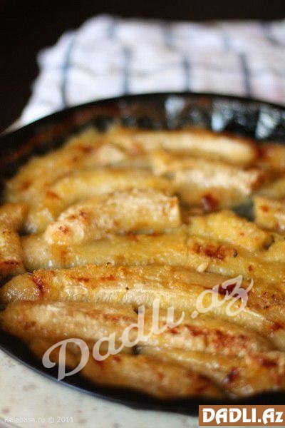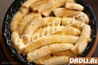 Formanı bolluca kərə yağı ilə yağlayın. Bananları təmizləyib hər birini uzununa bölün. Formaya bir lay döşəyin.