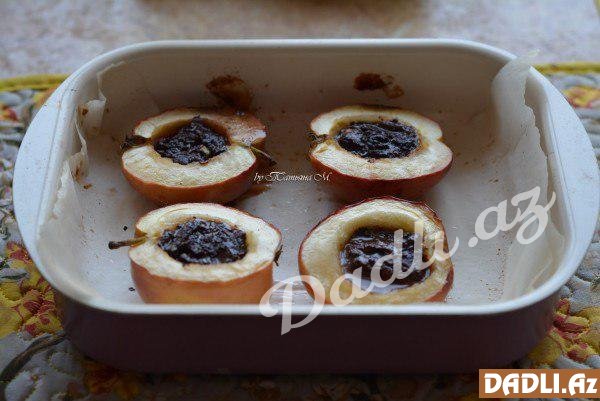 Formanın içinə perqament döşəyib almaları içinə yığın. Cecənin yerindəki çuxura 2 dilim şokoladla 2 araxis qoyun.
