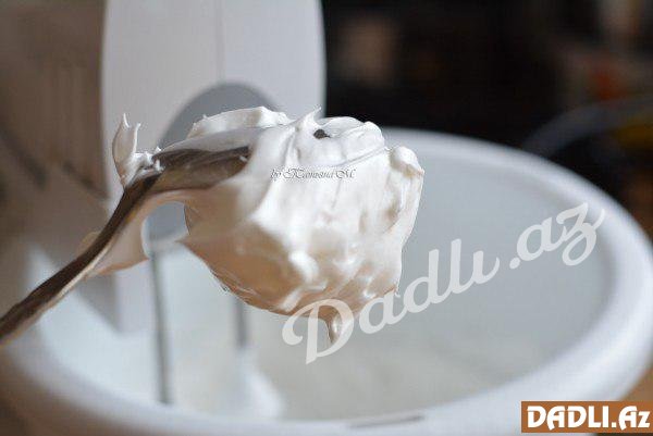 Yumurta ağlarını şəkər tozu ilə möhkəm çalın. Yəni qaşıqla götürüb tərsinə çevirəndə axmamalıdır. Azca turş olması üçün çalarkən 1 çimdik limon duzu qata bilərsiniz.
