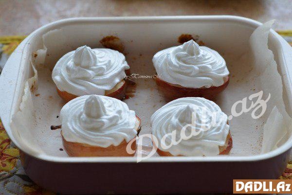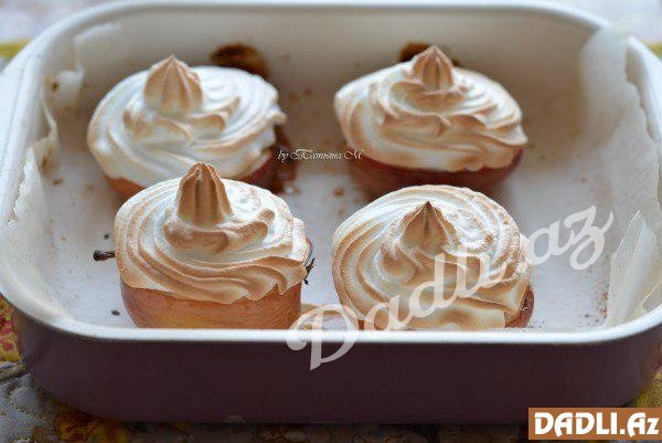 Bezeni qənnadı torbasına yığıb almaların üzərinə sıxın. Yenidən sobaya qoyub merengi qızaranadək bişirin.