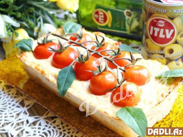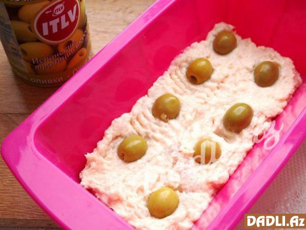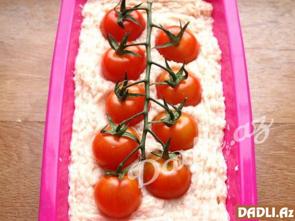 Formaya kütlənin 1/3-ni döşəyin. Zeytunları düzün. Kütlənin 1/3-ni döşəyib yenə zeytun düzün. Toyuqlu kütlənin qalanını döşəyib üzərinə çerri pomidorlarını düzün, azca içinə basdırın.