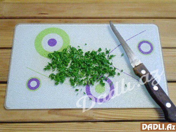 Göyərtini xırdalayın. Şüyüd və göy soğandan, yaxud başqa sevdiyiniz göyərtidən istifadə edə bilərsiniz.