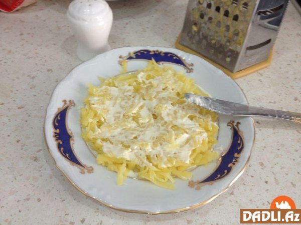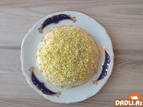 Qeyd: Əslində salatın üstünə holland pendiri sürtgəcdən keçirilib vurulur. Mən yumurta sarısı ilə hazırladım.