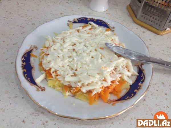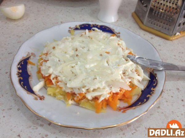 4. Kartofun üzərinə kök sürtgəcdən keçirilir, duz mayonez vurulur. Kökün üzərinə isə yumurtanın ağları sürtgəcdən keçirilir.