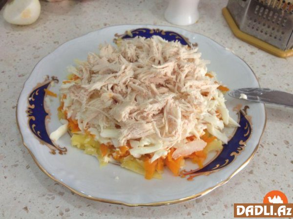 6. Didilmiş toyuq əti soğanının üstənə əlavə edilib mayonez vurulur.