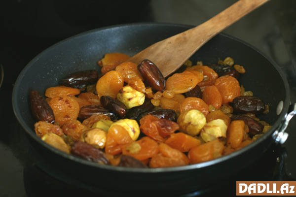 Digər ərzaqları hazırlayın. Tavada 2 xörək qaşığı yağ qızdırın. Təmizlənmiş şabalıdı yağa əlavə edib təxminən 3 dəqiqə ərzində qızardın. Üstünə ərik, gavalı və xurmanı əlavə edin və 3 dəqiqə də qızardın. Kişmişi də buraya əlavə edib 1 dəqiqə qızardın. Tavanı kənara çəkin.